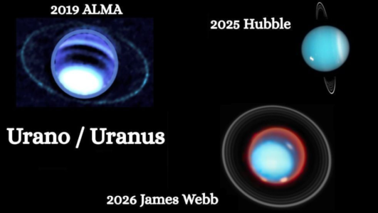 Sétimo planeta do Sistema Solar, Urano aparece com seus anéis em diferentes registros espaciais, o que mostra a evolução da observação e da tecnologia com o passar dos anos.