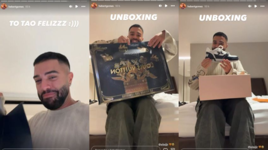 Em seguida, ele abre a caixa e mostra o par de tênis que ganhou do jogador de futebol. “Mano, para quem sabe, esse tênis é carérrimo. E eu amei que ele é preto e branco, combina com tudo”, diz. Depois, Hebert revela que o presente foi dado por Vini Jr.