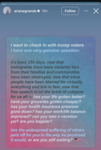 “Quero saber dos eleitores de Trump. Tenho uma pergunta sincera: já se passaram 250 dias. Agora que imigrantes foram violentamente separados de suas famílias, comunidades destruídas, pessoas trans culpadas por quase tudo e vivendo com medo, e a liberdade de expressão ameaçada, a vida de vocês melhorou?”, escreveu Ariana.
