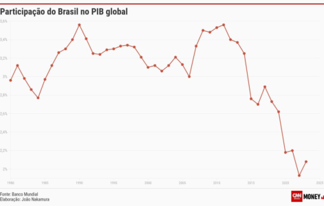 No início da década de 2010, houve uma recuperação temporária para o patamar de 3,5%, mas o movimento não se sustentou. Em 2023, a fatia do Brasil no PIB global caiu para 2,08%.