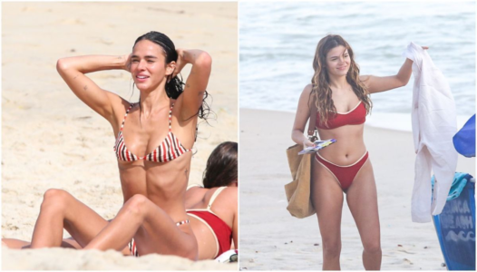 Bruna usou um biquíni listrado em tons de vermelho, marrom e bege, e Luana apostou em uma roupa de banho toda vermelha.
