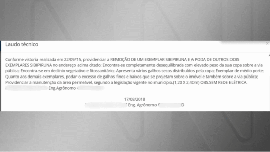Em 2015, uma vistoria foi realizada, mas apenas em 2018 um engenheiro agrônomo emitiu um laudo atestando que a árvore estava “completamente desequilibrada”, “com elevado peso na copa” e em “declínio vegetativo e fitossanitário”. Veja: