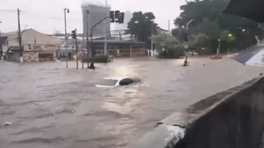 Um homem entrou na água para tentar ajudar pessoas em um veículo quase totalmente submerso durante a enchente e não retornou. A água estava corrente e, até o momento, não há vítimas confirmadas nessa ocorrência.