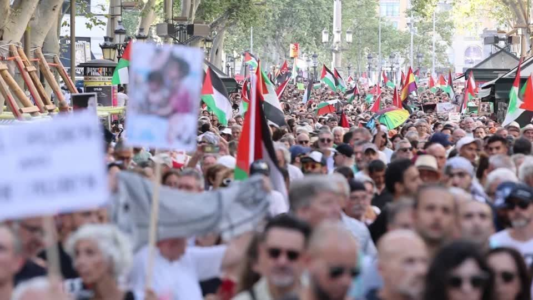 Centenas de pessoas marcharam em Barcelona neste sábado (9) em apoio aos palestinos e contra a guerra na Faixa de Gaza.