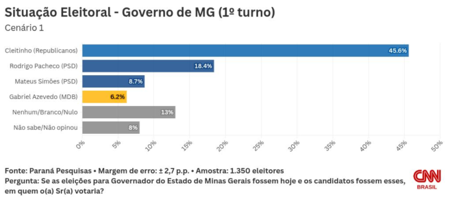 No primeiro cenário, Cleitinho registra 45,6% das intenções de voto, contra 18,4% de Pacheco. Simões aparece com 8,7% e o ex-presidente da Câmara Municipal de Belo Horizonte Gabriel Azevedo (MDB), com 6,2%. Brancos e nulos somam 13%, enquanto 8% não souberam responder.