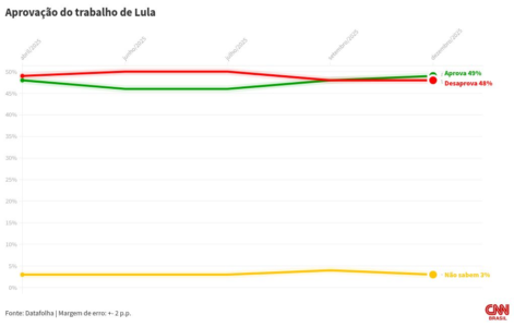 O trabalho do presidente Luiz Inácio Lula da Silva (PT) tem sua aprovação e desaprovação em igualdade, segundo pesquisa Datafolha divulgada nesta sexta-feira (5).