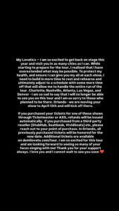 Anúncio de cancelamento de datas da turnê de Demi Lovato pelos Estados Unidos • Instagram/Demi Lovato