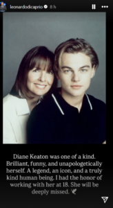 Foram muitas as estrelas que prestaram uma homenagem a Diane Keaton. No sábado, dia 11 de outubro, depois da notícia da sua partida ter se tornado pública, artistas como Leonardo DiCaprio fizeram questão de se manifestar publicamente.