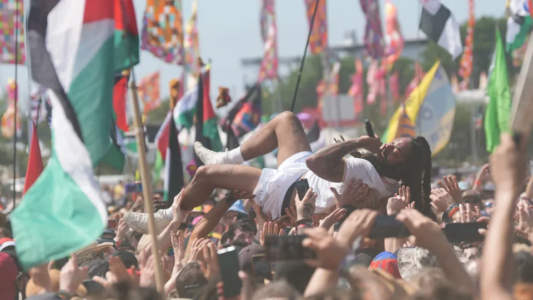 No mesmo evento, um dos membros do trio de rap irlandês Kneecap, Liam O’Hanna, subiu ao palco usando um lenço palestino e expressou apoio ao Palestine Action Group.