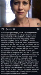 “É com profunda tristeza e pesar que Max, Gloria e toda a família Cavalera anunciam o falecimento de sua amada filha, irmã e mãe, Christina. Após uma longa batalha contra a doença, ela encontrou a paz ao lado de seus dois filhos, Adam e Moses, e seu irmão Dana”, diz o comunicado. A causa da morte não foi detalhada.