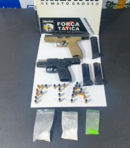 Policiais militares da Força Tática do 5º Comando Regional prenderam dois homens, de 37 e 40 anos, por porte ilegal de arma de fogo, na noite desta segunda-feira (23.2), em Barra do Garças. Com os suspeitos, foram recolhidas duas pistolas de calibre 9.mm e 27 munições do mesmo calibre, e seis porções de cocaína e ecstasy.