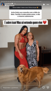 “Acho lindo sua conexão com a mãe do Belo. Família é onde existe amor, e não o mesmo sobrenome”, escreveu um seguidor. Gracyanne, então, respondeu: “É sobre isso! Mas só entende quem vive”.