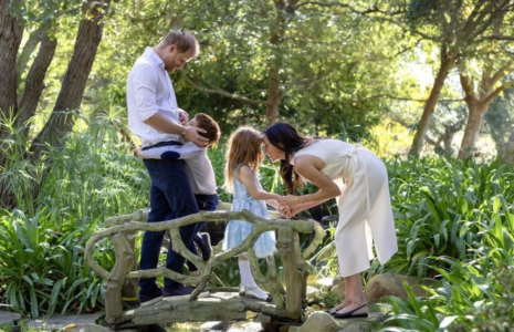 Archie aparece abraçando o pai, enquanto Lilibet dá as mãos à mãe.