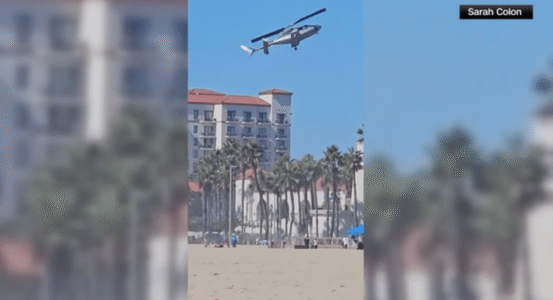 Imagens feitas por testemunhas mostraram os destroços do helicóptero sobre uma estrutura atrás de uma fileira de palmeiras perto do Hotel Hyatt, em Huntington Beach. As palavras na passarela suspensa diziam “Huntington Beach Club”, mostrou a filmagem.