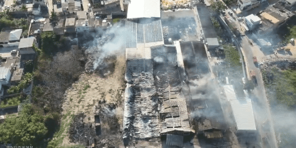 Imagens registradas por drones mostram a área da fábrica após o incêndio, com o imóvel severamente atingido e parte do teto danificada. Veja: