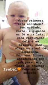 “Nossa princesa está acordada! Bem cuidada, forte, e gigante na fé e na luta. Cada respiração dela é um milagre, cada olhar um sinal de esperança. Seguimos firmes, agradecidos por cada passo e por todas as orações. Deus está conosco”, escreveu.