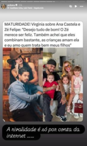 No story do Instagram, Poliana compartilhou uma publicação que destaca uma suposta declaração de Virginia sobre a vida amorosa do ex-marido. No post, a apresentadora diz que deseja felicidades ao ex e elogia a cantora sertaneja pela forma como ela trata seus filhos.