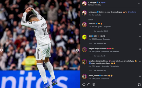Após a homenagem no gol e as declarações no pós-jogo, Kylian Mbappé usou as redes sociais para publicar uma mensagem celebrando o marco histórico no Real Madrid, na qual voltou a mencionar Cristiano Ronaldo.