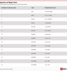 Para concorrer, os apostadores podem registrar seus jogos até uma hora antes do sorteio, às 20h, em qualquer casa lotérica credenciada pela Caixa, pelo site ou aplicativo do banco. O bilhete simples, com seis números marcados, custa R$ 6.