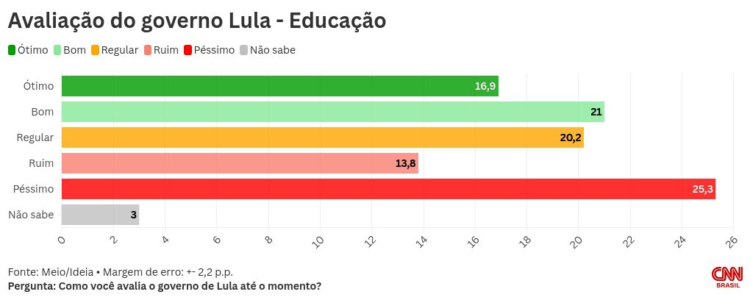 O governo do presidente Luiz Inácio Lula da Silva (PT) é avaliado negativamente por 41,4% da população brasileira, segundo pesquisa Meio/Ideia divulgada nesta terça-feira (13). Por outro lado, 35% avaliam positivamente a administração federal.