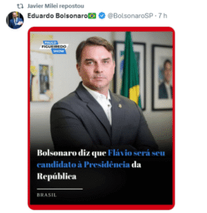 A publicação traz uma foto do filho mais velho do ex-presidente Jair Bolsonaro com a legenda “Bolsonaro diz que Flávio será seu candidato à Presidência da República”. Milei compartilhou o post no X (antigo Twitter).