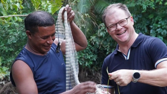 A publicação estampou uma foto de Schneider pescando com um brasileiro em Belém, capital do Pará, onde ocorre a COP30.