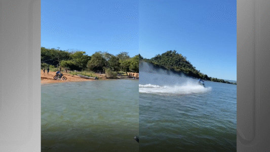 No vídeo que circula nas redes sociais, é possível ver a moto saindo da margem e, com a ajuda de uma adaptação nas rodas, flutuando sobre o rio como se estivesse “surfando”.