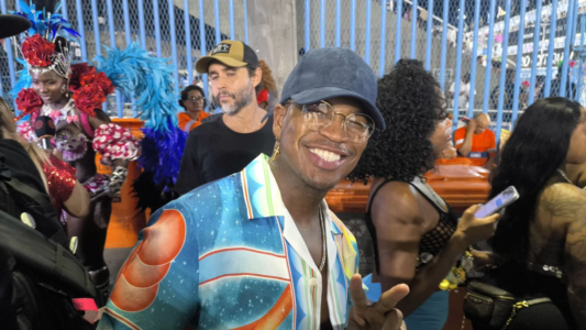 O cantor Ne-Yo surgiu na Marquês de Sapucaí cercado por seguranças e passou rapidamente pela concentração, chamando a atenção do público.