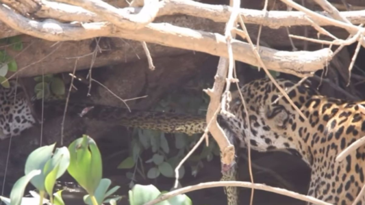 Imagens registraram o momento em que duas onças-pintadas — um macho e uma fêmea — disputavam uma cobra sucuri-amarela nesta segunda-feira (20), no Pantanal, em Mato Grosso do Sul.
