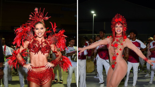 Reinando à frente da bateria furiosa desde 2008, Viviane Araújo brilhou com um figurino todo vermelho, com rosas aplicadas, em referência à agremiação que levará para a Marquês de Sapucaí “A delirante jornada carnavalesca da professora que não tinha medo de bruxa, do bacalhau e do pirata da perna-de-pau”, e busca encerrar o jejum de 17 anos sem vitórias.