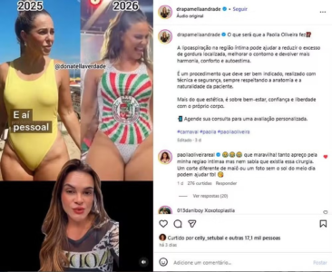 “E aí, pessoal, o que será que a Paolla Oliveira fez para ter essa mudança na região íntima? Vocês me perguntam, eu tento responder. É claro que a gente não tem como afirmar o que a Paola fez para poder ter essa mudança muito visível da região íntima, mas, no geral, as pacientes que têm essa região mais gordinha e sentem um incômodo, nós propomos uma lipo, uma lipo do Monte de Vênus. E aí a gente consegue dar uma emagrecida nessa região e deixa a mulher mais confortável para poder usar um maiô desse daí e ficar ainda mais maravilhosa, porque, gente, pode perguntar o que quiser, mas Paolla é Paolla, arrasa em todo o carnaval e merece todo nosso respeito. Eu estou aqui só para dizer para vocês que ela fez essa mudança, com certeza, está feliz com o corpo e que se você quiser também, você pode”, disse a cirurgiã.