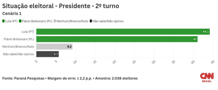 O presidente Luiz Inácio Lula da Silva (PT) empata tecnicamente com Flávio Bolsonaro (PL-RJ), Tarcísio de Freitas (Republicanos), Michelle Bolsonaro (PL) e Ratinho Junior (PSD-PR) em eventual segundo turno na disputa pela Presidência da República. Os dados são de levantamento do instituto Paraná Pesquisas divulgado nesta sexta-feira (26).