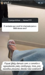 A influenciadora Poliana Rocha, 49, contou que foi convidada para o BBB 26. Nas redes sociais, ela contou que recusou o convite e revelou o motivo por trás da decisão.
