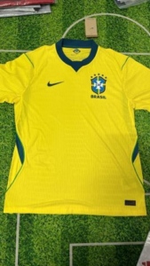 Outros elementos da camisa aparecem em verde Light Menta. Esse tom é aplicado em arcos nas costas, em linhas finas que contornam ombros e laterais e também nos punhos. O escudo da CBF fica no lado esquerdo do peito, enquanto o “Swoosh” da Nike surge à direita, também em verde. Dentro da gola, um selo com a inscrição “Vai Brasa” aparece dentro de um pequeno losango.