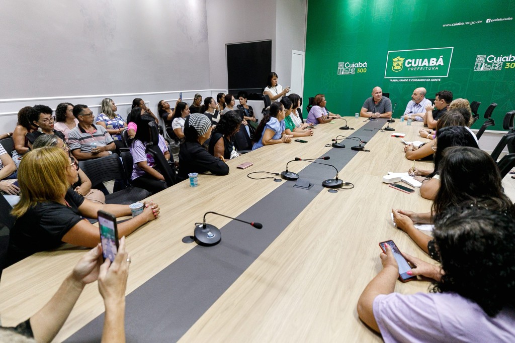 A imagem mostra o prefeito Abilio Brunini liderando a reunião com uma comitiva das Técnicas de Desenvolvimento Infantil, no Salão Nobre do Palácio Paiaguás. Uma mesa grande compõe o cenário, onde dezenas de profissionais da educação estão sentadas.
