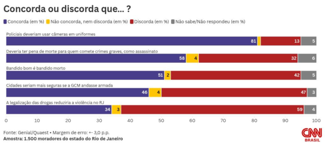 No estado do Rio de Janeiro, 51% da população concorda com a frase “bandido bom é bandido morto“, enquanto 42% discordam. É o que mostra pesquisa Genial/Quaest divulgada nesta segunda-feira (3).
