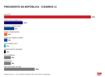 O petista aparece com ampla vantagem sobre os adversários. No primeiro cenário, Lula soma 51% das intenções de voto, contra 11% do segundo colocado, senador Flávio Bolsonaro (PL-RJ).