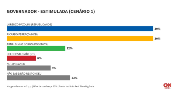 Ao todo, quatro cenários foram testados. Em um primeiro panorama, Pazolini aparece com 30% das intenções de voto, em empate com Ferraço.
