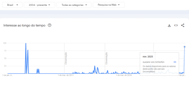 Conforme mostra o gráfico, as pesquisas pelo nome Suzane começaram a crescer ao redor do Brasil em novembro. “Tremembé” estreou na plataforma de streaming em 31 de outubro deste ano.