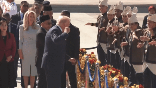 Após quase 24 horas de viagem com duas paradas para reabastecimento, um tapete vermelho foi colocado na pista do aeroporto e Trump foi recebido em uma cerimônia em que dezenas de convidados especiais se reuniram.