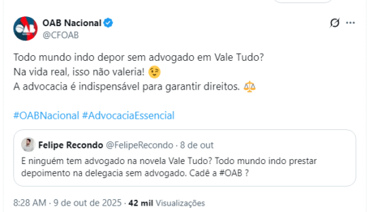 “Todo mundo indo depor sem advogado em ‘Vale Tudo‘? Na vida real, isso não valeria! A advocacia é indispensável para garantir direitos”, inicia o perfil oficial da instituição. “A presença da(o) advogado(a) é um direito de toda pessoa. Ninguém deve ser ouvido em investigação, interrogatório ou audiência sem assistência jurídica. É isso que garante um processo justo e equilibrado”.