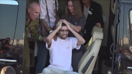 David é visto em um veículo cercado por seus familiares mais próximos. Com um grande sorriso no rosto, ele parece quase incrédulo, com as mãos na boca, enquanto seus amigos gritam: “Evyatar, você é um rei!”.