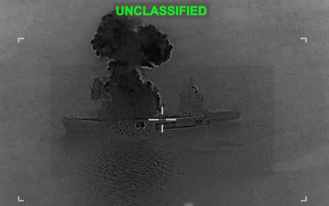 As imagens, publicadas na rede social X, exibem a embarcação sendo alvo de um disparo registrado por uma câmera com mira, semelhante às usadas em sistemas de armamento. Após o impacto, o navio aparece envolto em fogo.
