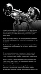 “É com profunda tristeza que anunciamos o falecimento de nosso amado marido, pai e renomado músico, Willie Colón. Ele faleceu em paz esta manhã, cercado por sua amada família”, diz o comunicado publicado no Facebook.